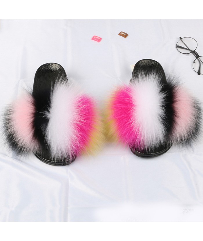 Damen Pelzpantoffeln Real Fox Pelzrutschen Damen Home Pelzige flache Sandalen Weiblich Niedlicher Flauschiger Strand