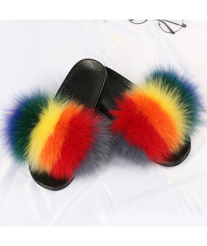 Damen Pelzpantoffeln Real Fox Pelzrutschen Damen Home Pelzige flache Sandalen Weiblich Niedlicher Flauschiger Strand