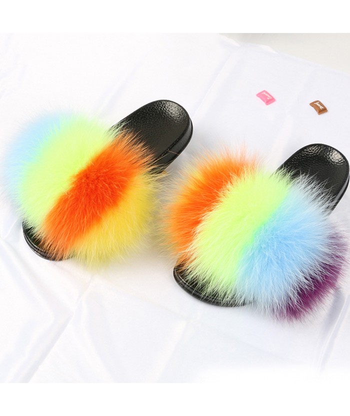 Women Fur Slippers Real Fox Fur Slides Ladies Home Furry Flat Sandals Female Cute Fluffy Beach