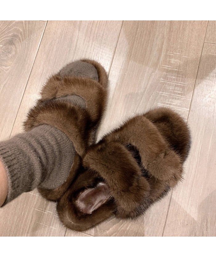 Sandalias de pelo de visón real para mujer de otoño Sandalias planas peludas para mujer